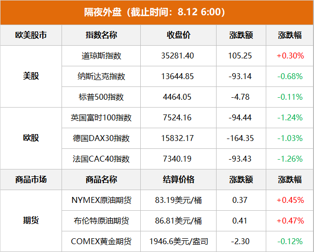 商品市场:国际油价收跌,WTI 9月原油期货收涨0.37美元,涨幅0.45%,报83.19美元/桶;布伦特10月原油期货原油期货收涨0.41美元,涨幅0.47%,报86.81美元/桶。纽约商品交易所黄金期货市场交投最活跃的12月黄金期价8日下跌2.3美元,收于每盎司1946.6美元,跌幅为0.12%,本周累跌1.49%。