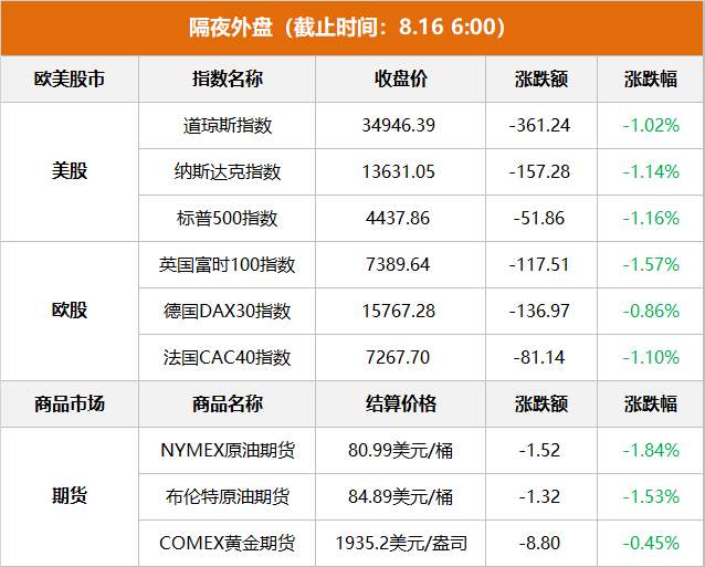 美股市场:美股集体下跌,截止收盘,三大指数跌幅均超1%。道琼斯指数收跌361.24点,跌幅1.02%,报34946.39点;纳斯达克收跌157.28点,跌幅1.14%,报13631.05点;标普500指数收跌51.86点,跌幅1.16%,报4437.86点。