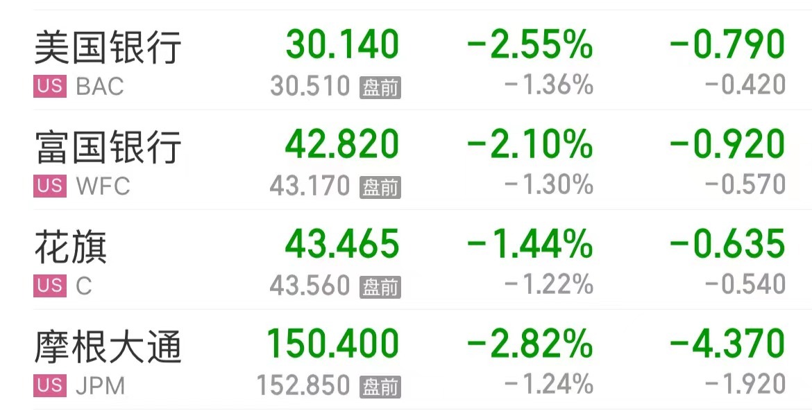 银行板块下跌,美国前四大银行市值累计蒸发235.65亿美元(约合人民币1716.21亿元)。