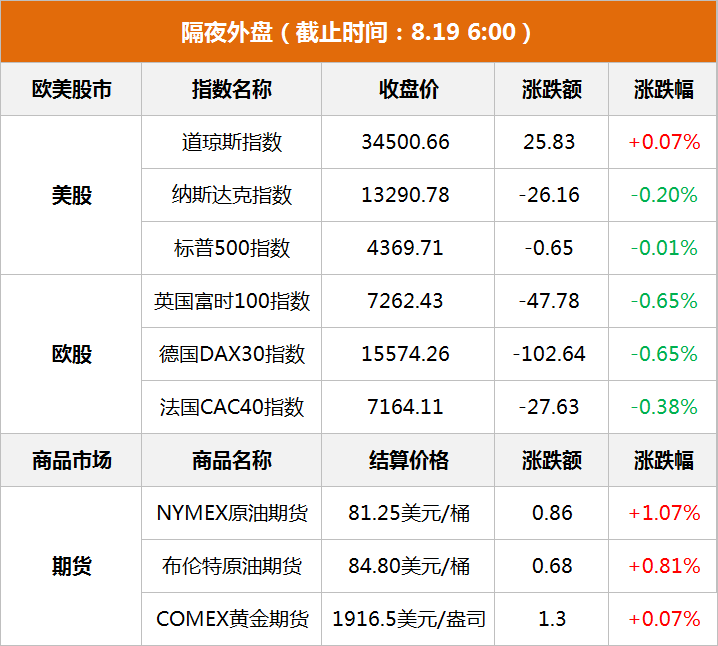 商品市场:国际油价收涨,截至当天收盘,纽约商品交易所9月交货的轻质原油期货价格上涨86美分,收于每桶81.25美元,涨幅为1.07%;10月交货的伦敦布伦特原油期货价格上涨68美分,收于每桶84.8美元,涨幅为0.81%。纽约商品交易所黄金期货市场交投最活跃的12月黄金期价18日上涨1.3美元,收于每盎司1916.5美元,涨幅为0.07%。