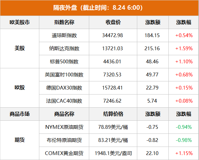商品市场:国际油价收跌,截至当天收盘,纽约商品交易所9月交货的轻质原油期货价格下跌0.75美元,收于每桶78.89美元,跌幅为0.94%;10月交货的伦敦布伦特原油期货价格下跌0.82美元,收于每桶83.21美元,跌幅为0.98%。纽约商品交易所黄金期货市场交投最活跃的12月黄金期价21日比前一交易日上涨22.1美元,收于每盎司1948.1美元,涨幅为1.15%。