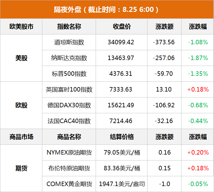 商品市场:国际油价微涨,截至当天收盘,纽约商品交易所10月交货的轻质原油期货价格上涨16美分,收于每桶79.05美元,涨幅为0.20%;10月交货的伦敦布伦特原油期货价格上涨15美分,收于每桶83.36美元,涨幅为0.18%。纽约商品交易所黄金期货市场交投最活跃的12月黄金期价24日下跌1美元,收于每盎司1947.1美元,跌幅为0.05%。