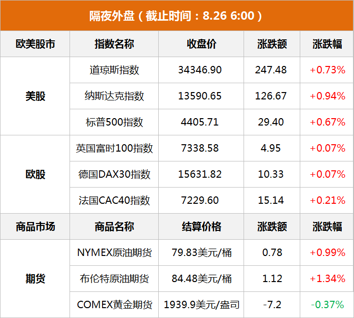 商品市场:国际油价上涨,截至当天收盘,纽约商品交易所10月交货的轻质原油期货价格上涨78美分,收于每桶79.83美元,涨幅为0.99%;10月交货的伦敦布伦特原油期货价格上涨1.12美元,收于每桶84.48美元,涨幅为1.34%。纽约商品交易所黄金期货市场交投最活跃的12月黄金期价25日下跌7.2美元,收于每盎司1939.9美元,跌幅为0.37%。