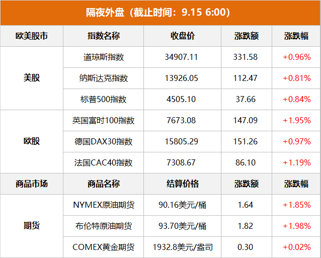 美股市场:美股三大指数集体上涨,截止收盘,道琼斯指数收涨331.58点,收于34907.11点,涨幅为0.96%;标普500指数收涨37.66点,收于4505.10点,涨幅为0.84%;纳斯达克指数收涨112.47点,收于13926.05点,涨幅为0.81%。美国8月PPI与零售销售数据均高于预期,上周初请失业救济人数升至22万符合预期。欧洲央行连续第10次加息。