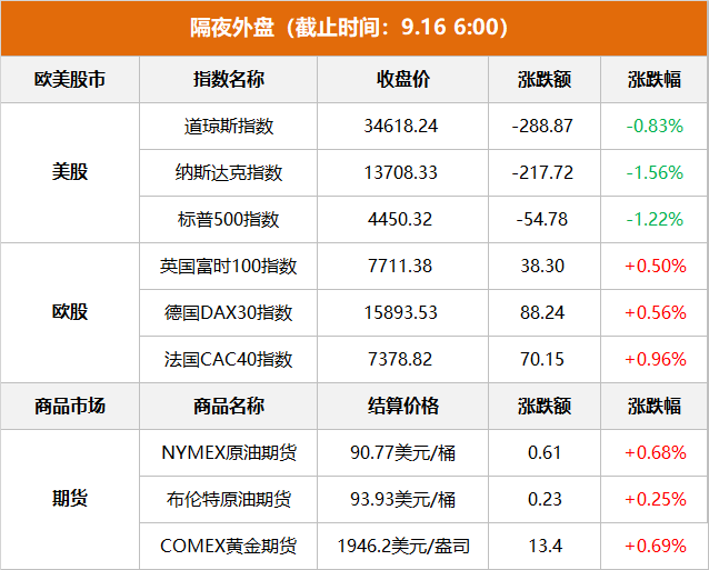 商品市场:国际油价上涨,截止收盘,WTI 10月原油期货上涨61美分,收于每桶90.77美元,涨幅为0.68%;11月交货的伦敦布伦特原油期货价格上涨23美分,收于每桶93.93美元,涨幅为0.25%。纽约商品交易所黄金期货市场交投最活跃的12月黄金期价15日上涨13.4美元,收于每盎司1946.2美元,涨幅为0.69%。