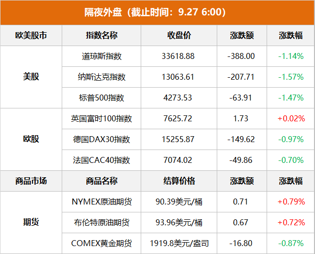 美股市场:美股三大指数集体下跌,截至收盘,道琼斯指数下跌388.00点,收于33618.88点,跌幅为1.14%;纳斯达克指数下跌207.71点,收于13063.61点,跌幅为1.57%;标普500指数下跌63.91点,收于4273.53点,跌幅为1.47%。