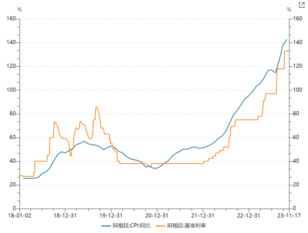 阿根廷通货膨胀和基准利率走势(2018年至今)