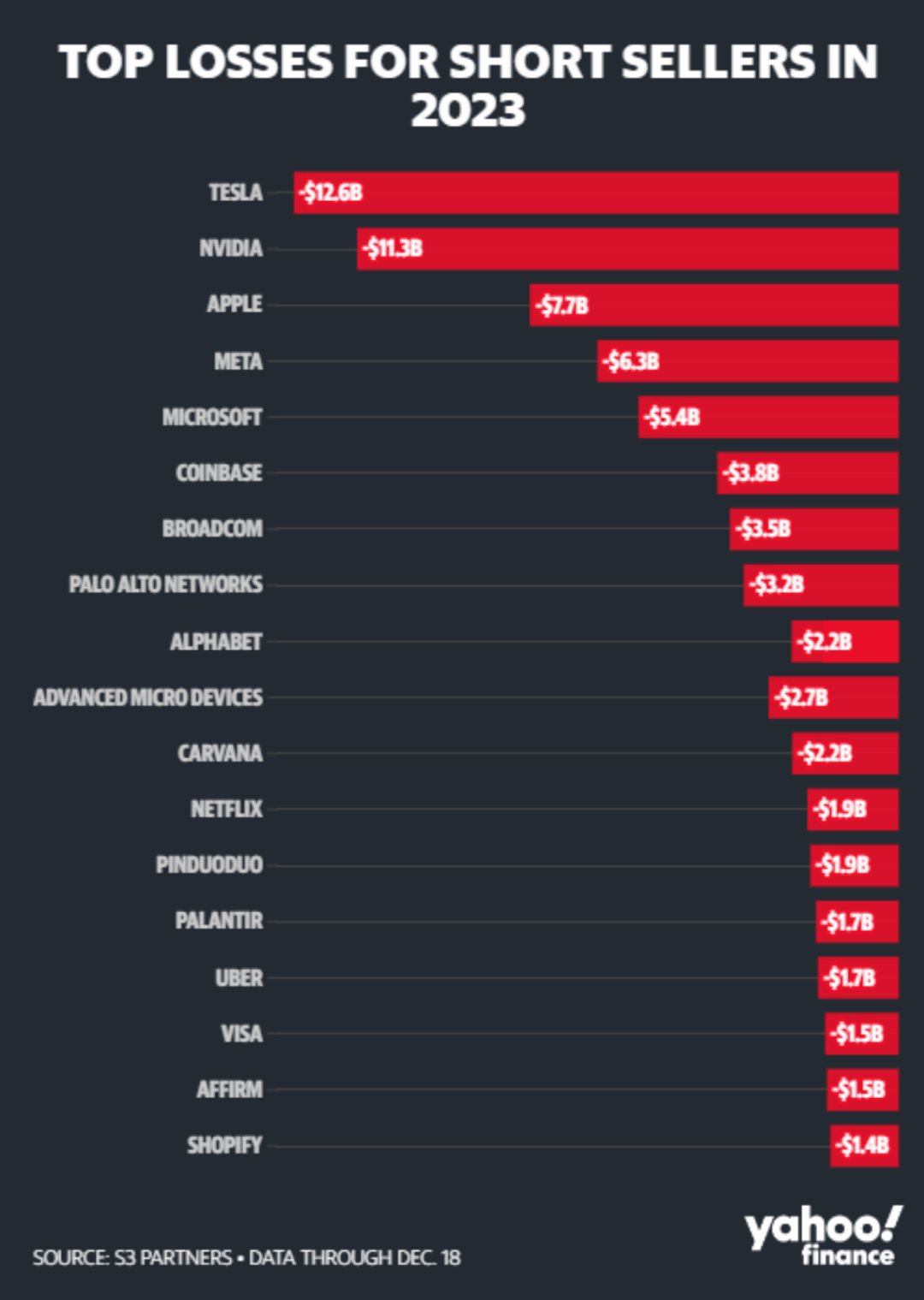 其中,大举做空美股科技巨头们的投资者损失最为惨重。2023年年内,空头在特斯拉、英伟达、苹果、Meta和微软的损失分别达126亿美元、113亿美元、77亿美元、63亿美元、54亿美元。