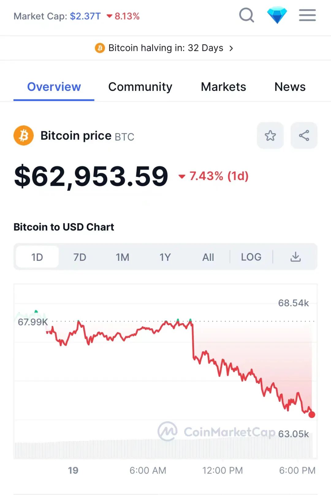 北京时间3月19日晚间,比特币价格一度跌破63000美元整数关口,日内最大跌幅超7.4%;以太坊价格一度暴跌超10%。