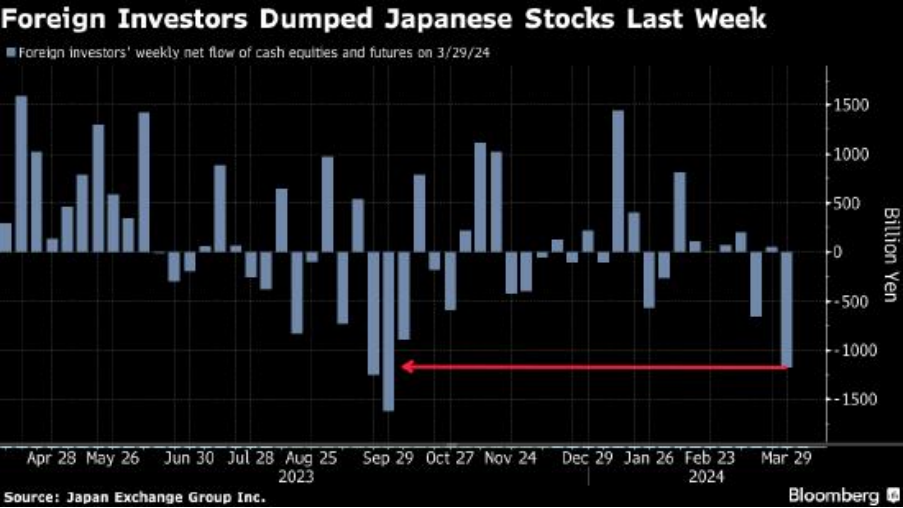 值得注意的是,正当巴菲特突然出手之际,外资却在持续抛售日本股票。据日本交易所集团披露的最新数据,外国投资者在截至3月29日的一周内,净卖出了1.18万亿日元(约合人民币562亿元)的日本股票现货和期货,创出了2023年9月最后一周以来的最高水平。