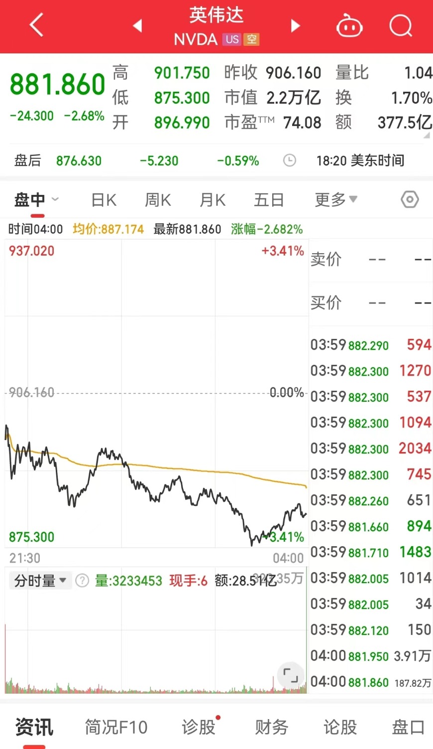 全球AI巨头英伟达(NVDA)报881.86美元,跌幅2.68%,市值一夜蒸发608亿美元(约合人民币4400亿元)。