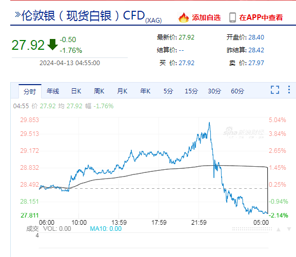 现货白银跌破28美元/盎司,此前一度涨超5%,现报27.92美元/盎司,日内跌1.76%。