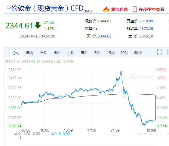 现货黄金持续向下,此前一度涨超2%,现报2344.61美元/盎司,日内跌1.17%。