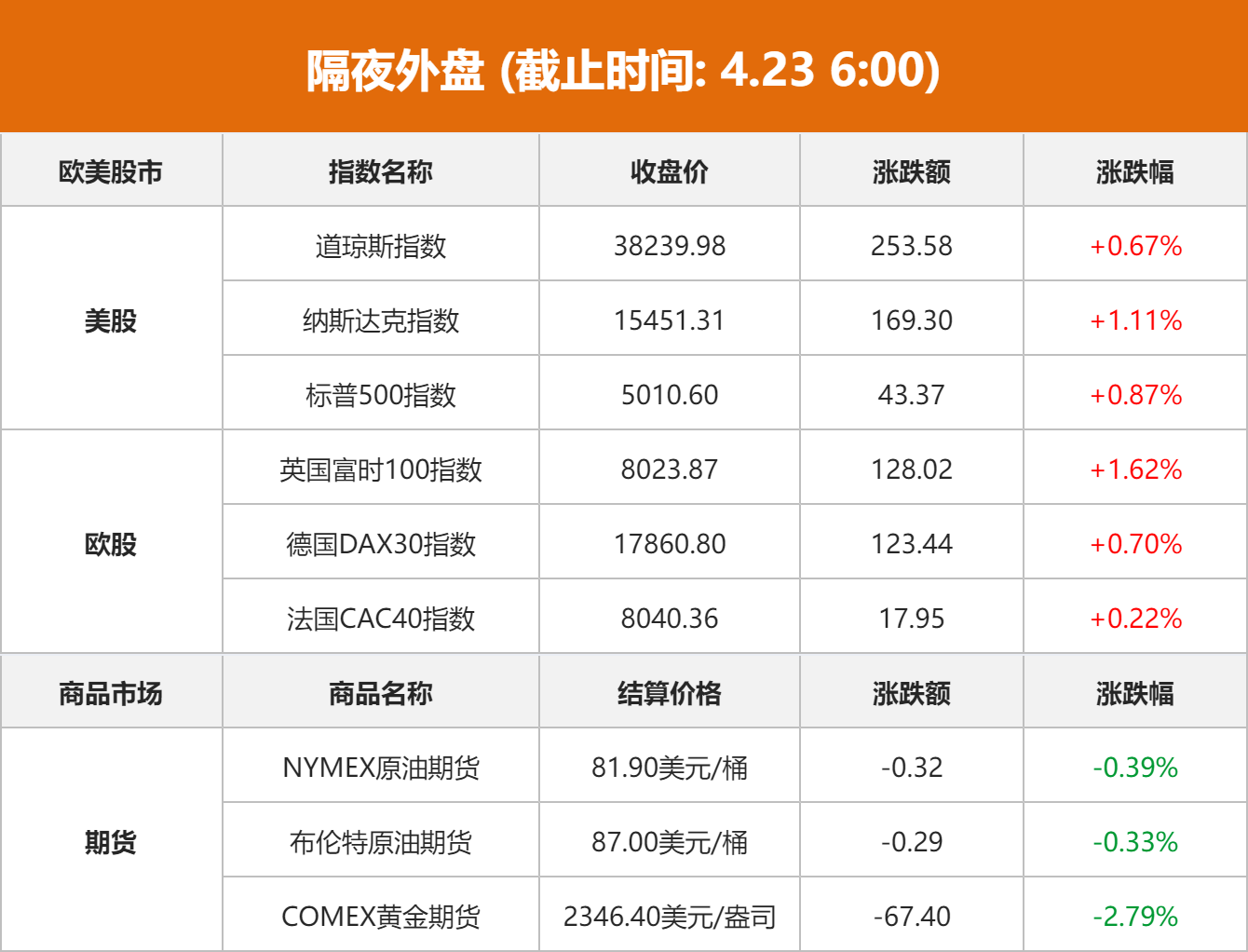 美股市场:美股三大指数集体收涨,标普、纳指终结六日线连跌,纳指涨超1%。截至收盘,道琼斯工业平均指数比前一交易日上涨253.58点,收于38239.98点,涨幅为0.67%;纳斯达克综合指数上涨169.30点,收于15451.31点,涨幅为1.11%;标准普尔500种股票指数上涨43.37点,收于5010.60点,涨幅为0.87%。