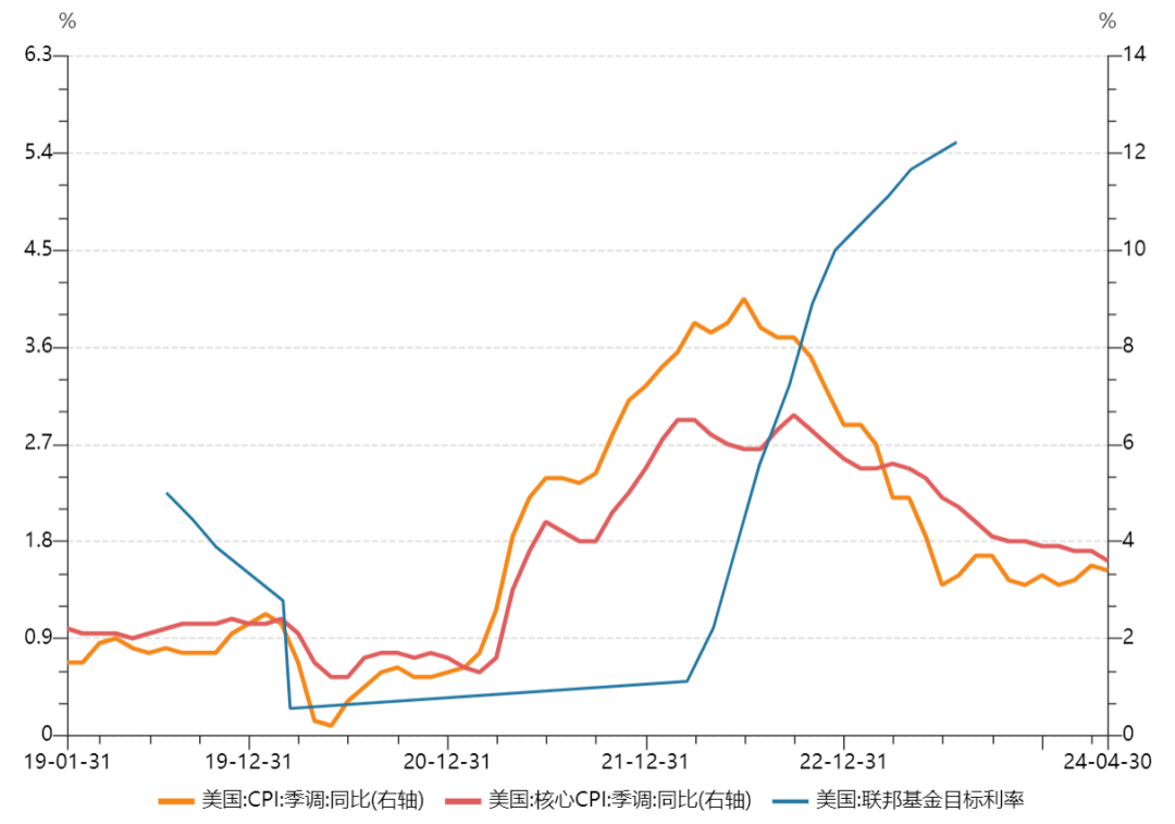 美国物价指数和基准利率走势(2019年1月至今)