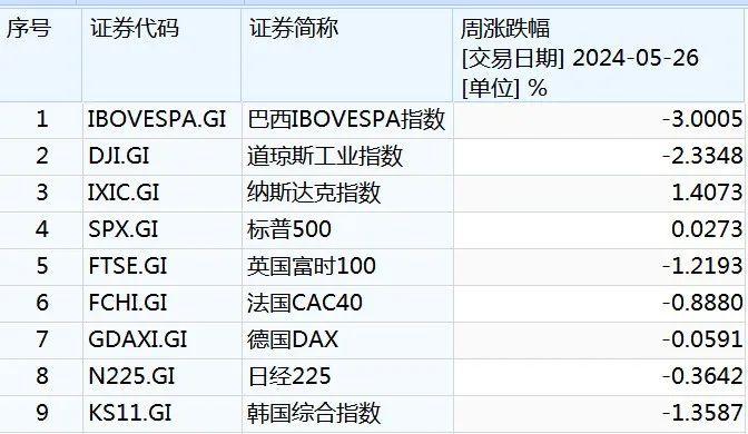 上周海外重要股票指数涨跌幅