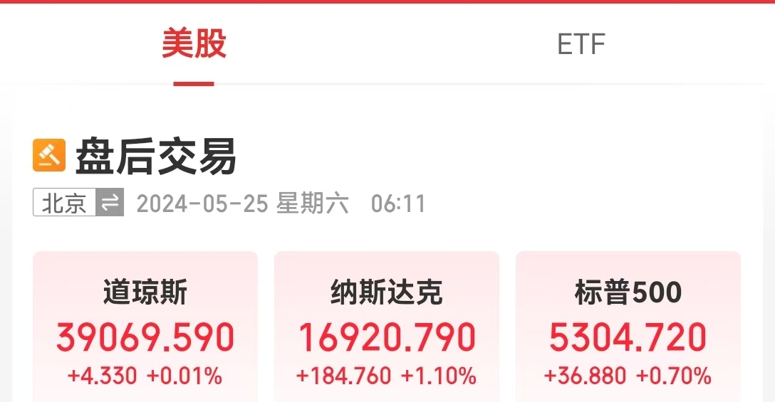 当地时间5月24日,美股三大指数集体收涨,道指涨0.01%;纳指涨1.1%,再创收盘历史新高;标普500指数涨0.7%。