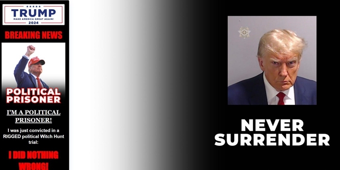 特朗普竞选官网立刻修改主页,把特朗普称为遭到政治迫害的“政治犯”,呼吁支持者捐款以击败“骗子”拜登。主页还放出特朗普在法庭报道时拍的“大头照”,图下配文:绝不投降。
