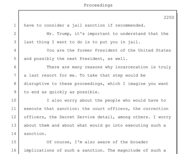 默坎表示,监禁只能是他的“最后选项”,他了解这一选项将给法院工作人员、特勤局特工和其他部门带来的难题。他也了解这一选项将带来更大范围的连带影响。但默坎同时指出,他有工作要做,他的工作就是守护司法系统的尊严。