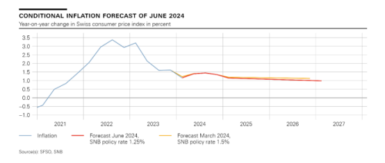 就未来通胀前景,瑞士央行预测2024年的年均通货膨胀率为1.3%,2025年为1.1%,2026年为1.0%。该预测基于这样一个假设,即在整个预测范围内,瑞士央行的政策利率为1.25%。这意味着,如果没有今天的降息,通货膨胀率会更低。