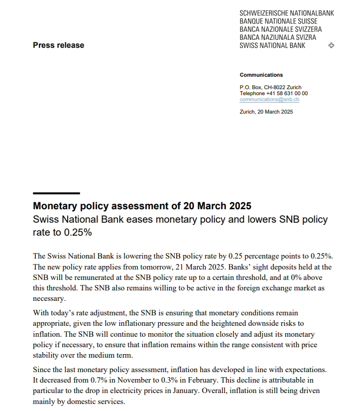 瑞士国家银行(SNB)将其政策利率下调25个基点至0.25%。新政策利率将于2025年3月21日起生效。银行在瑞士央行的活期存款将在一定门槛内按照政策利率计息,超过该门槛的部分将按0%计息。瑞士央行还表示,必要时仍愿意在外汇市场采取行动。