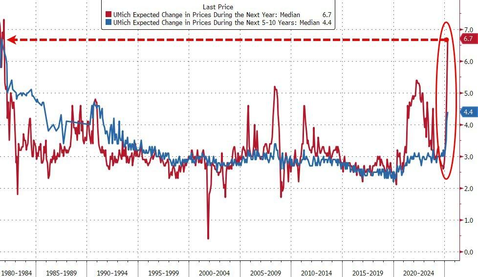 《每日经济新闻》记者(以下简称“每经记者”)注意到,在所谓“对等关税”的背景下,上周公布的关键通胀预期显示,美国短期通胀预期已经飙升至20世纪80年代初以来的最高水平。