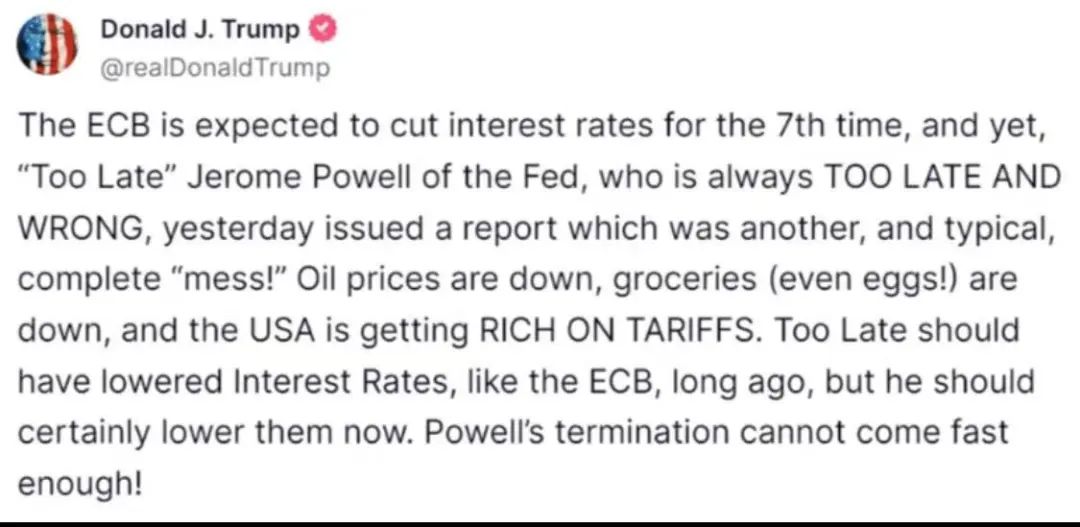 据证券时报e公司,特朗普在社交媒体表示,预计欧洲央行将进行第七次降息,然而,美联储主席鲍威尔的行动“为时已晚”,他总是行动太迟且决策错误。昨天他的发言又是典型的、彻头彻尾的“一团糟”!目前油价下跌了,食品杂货价格也下跌了,而且美国正从关税中获利颇丰。美联储早就应该像欧洲央行那样降低利率。很久之前就该这么做了,现在美联储肯定应该降低利率。鲍威尔被解雇的速度再快都不为过!