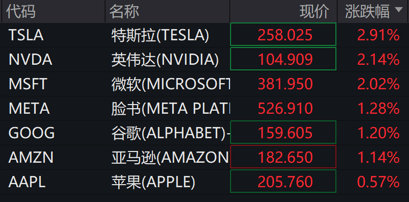美国科技七巨头集体上涨。特斯拉涨近3%,英伟达、微软涨超2%。