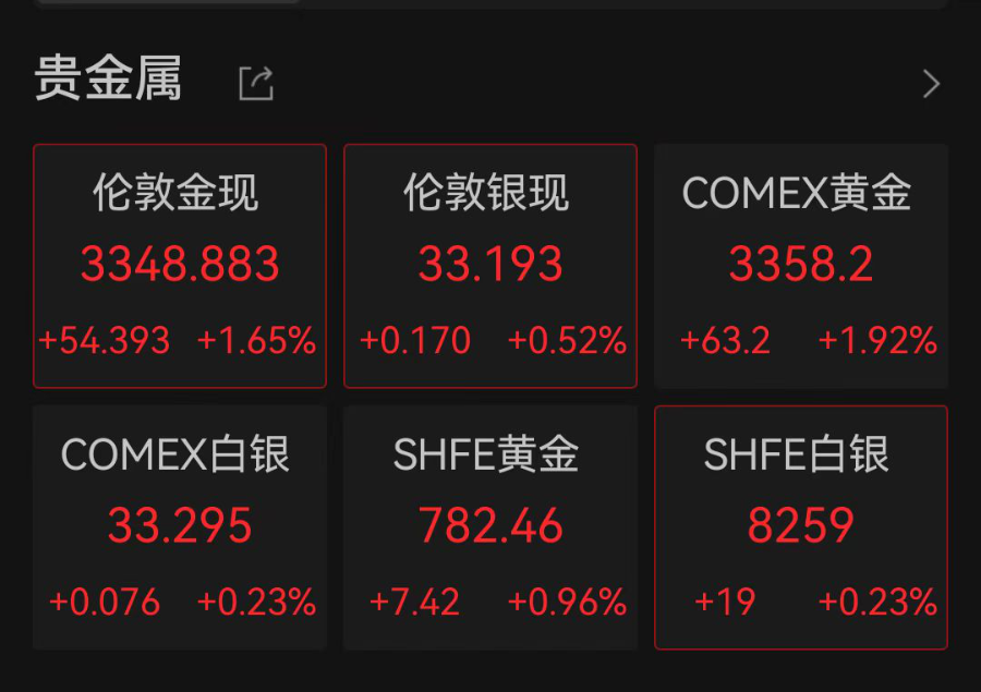 伦敦金现、COMEX黄金均一度涨超2%,站上3360美元/盎司,目前分别涨1.65%、1.92%,报3348.88美元/盎司、报3358.20美元/盎司。
