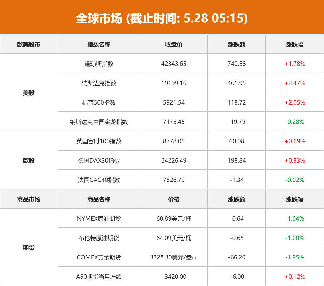 商品市场:COMEX黄金期货结算价下跌66.20美元,跌幅1.95%,报3328.30美元/盎司。纽约商品交易所7月交货的轻质原油期货价格下跌64美分,收于每桶60.89美元,跌幅为1.04%;7月交货的伦敦布伦特原油期货价格下跌65美分,收于每桶64.09美元,跌幅为1.00%。