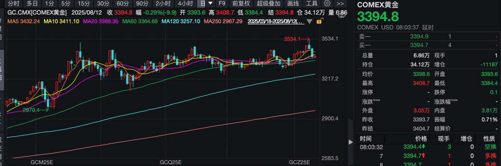 据新华社报道,特朗普8月11日下午发文称,黄金将不会被征收关税。受这一消息影响,COMEX黄金期货当天重挫2.48%,创今年5月以来最大跌幅。现货黄金价格周一大幅下挫1.6%,盘中最低触及3341.25美元/盎司。