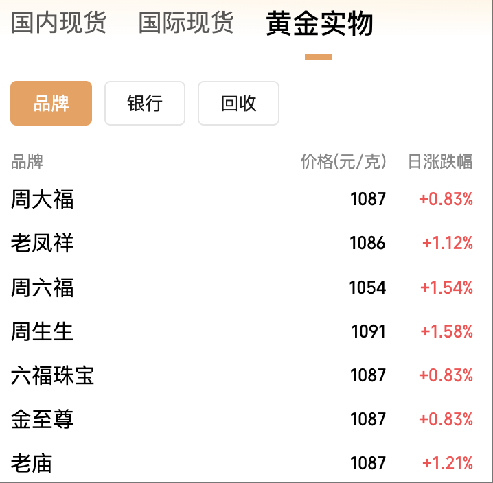 数据显示,9月16日,周生生金饰价格为1091元/克,较前一日上涨17元;老庙黄金为1087元/克,单日上涨13元;周大福、六福珠宝、金至尊为1087元/克,单日上涨9元。