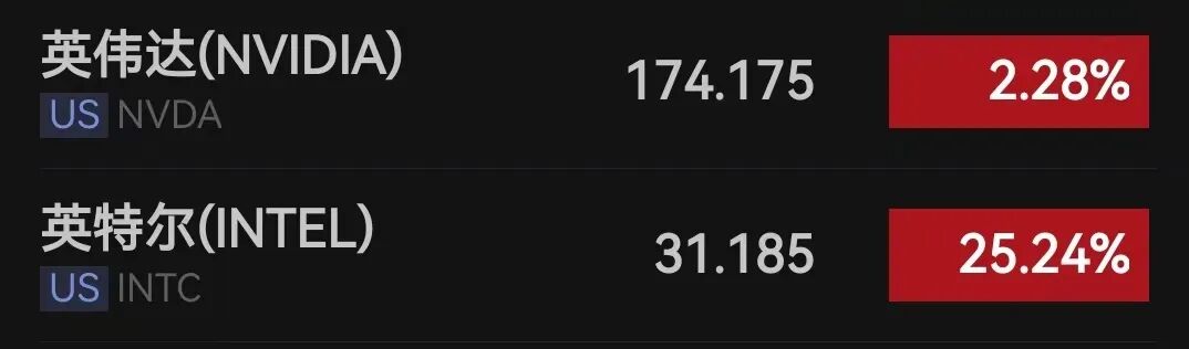 受此消息提振,英特尔股价盘前直线飙升,一度大涨逾30%;英伟达股价盘前涨逾2%。