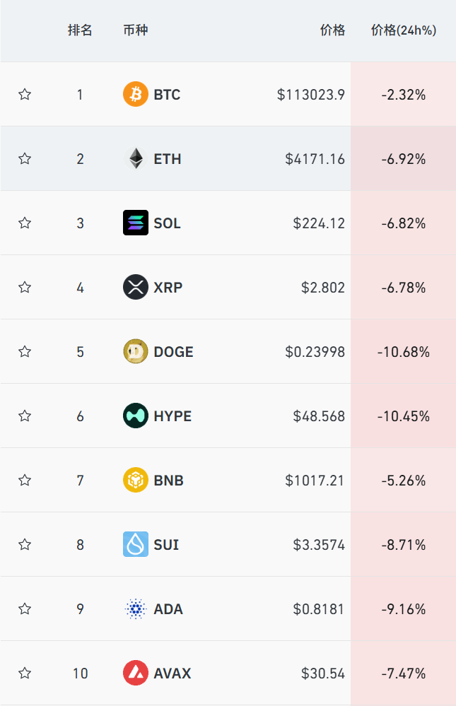 数据显示,过去24小时,主流加密货币价格集体走低,市场整体出现短时急跌,BTC、ETH、DOGE等跌幅明显。