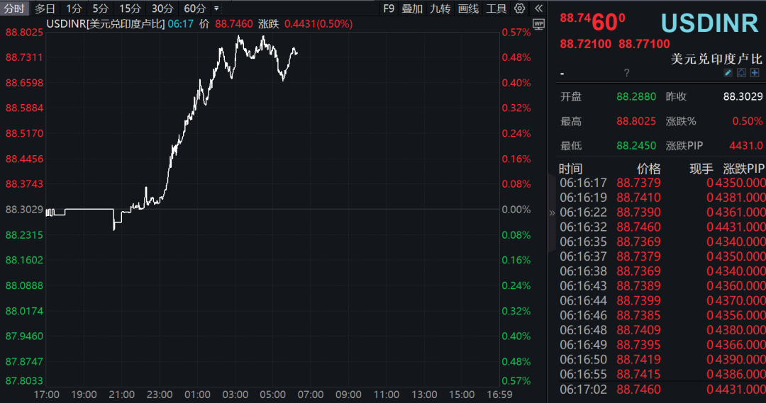 9月23日盘中,印度汇率再度跳水,卢比兑美元跌幅一度接近0.6%并跌破88.80,再创历史新低。自上周四以来,卢比兑美元累计跌幅接近1%。有交易员称,印度央行可能会通过国有银行出售美元以支撑卢比。